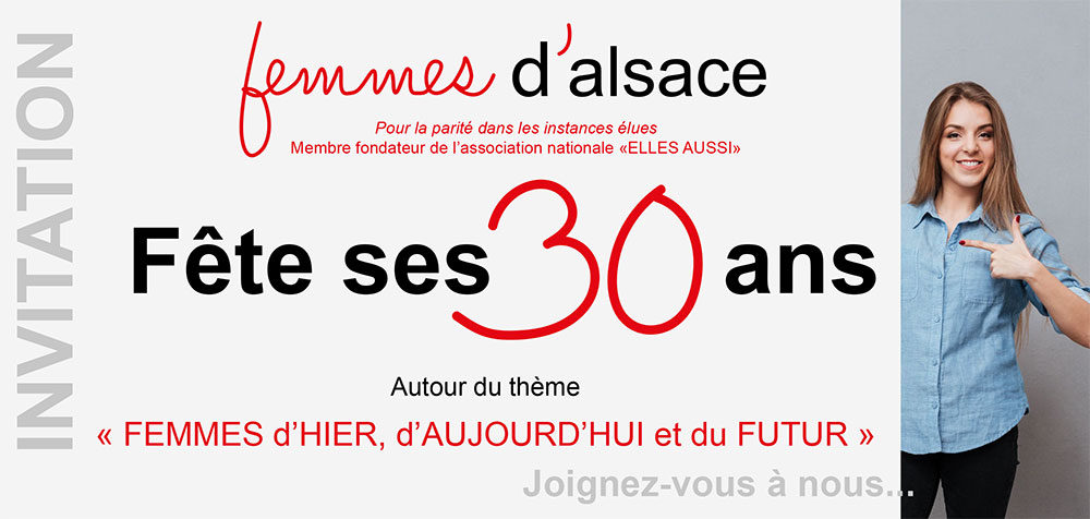Femmes d’Alsace, association membre fondateur d’Elles aussi fête ses 30 ans à Mulhouse autour du thème: « Femmes d’hier, d’aujourd’hui et du futur », en présence de Catherine Trautmann, ancienne ministre et maire de Strasbourg et Gérard Binder, professeur émérite de l’Université de Haute Alsace. Des femmes exerçant des métiers longtemps réservés aux hommes témoigneront.