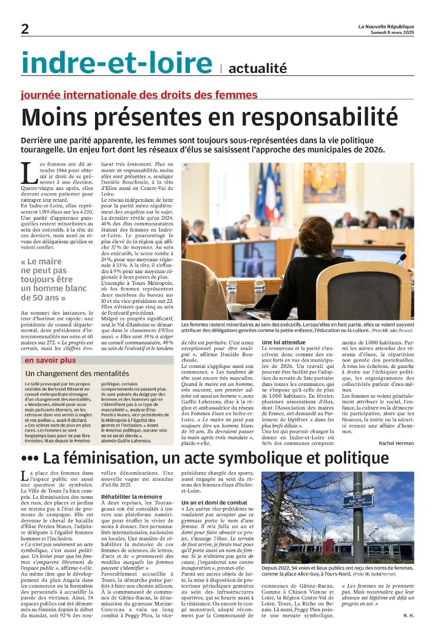 Le 8 mars, dans un article de la Nouvelle République Centre-Ouest, édition de Tours ( Indre-et-Loire en CVL), intervention de la responsable de Elles aussi CVL La sous-représentation globale des femmes dans le monde politique , leur présence moindre en responsabilité ( maires, présidentes, vice-présidentes) , l’enquête sur les EPCI de 2023, le projet loi pour des listes paritaires dans les petites communes ( 72% des communes de France ) y sont présentées.