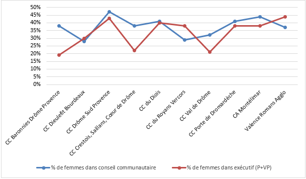 Moyennes dans la Drôme : femmes présidentes : 10% ; femmes conseillères : 37,6% ; femmes dans l’exécutif (P+VP) : 35,34% ; femmes parmi les VP : 37,7% (voir graphique ci-dessous)