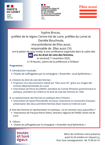 Avec le soutien de Sophie Brocas, Préfète de la région Centre-Val de Loire et du Loiret, que nous remercions, l’antenne Elles aussi Centre-Val de Loire a organisé un évènement autour des 80 ans du 1er vote des femmes et des 1ères élues dans les salons de la Préfecture à Orléans, le vendredi 7 novembre 2025. Ce fut aussi l’occasion de présenter le « guide de la candidate d’Elles aussi » de 2025.