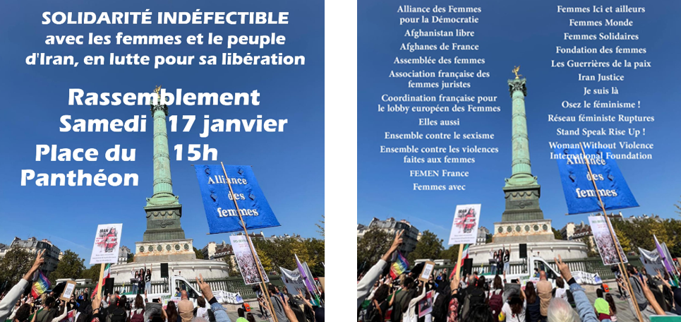 Elles aussi s’est joint à l’appel « solidarité indéfectible avec les femmes et le peuple d’Iran en lutte pour sa libération » à se rassembler samedi 17 janvier à 15h place du Panthéon à Paris.