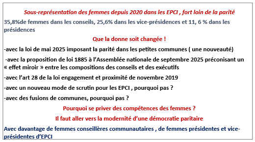 Les lois paritaires contraignantes successives, depuis la première loi du 6 juin 2000, ont ouvert aux femmes l’accès aux responsabilités politiques ; mais si l’on entend : « aujourd’hui en 2025, la parité et l’égalité c’est fait ! », donnons simplement les chiffres de la réalité.