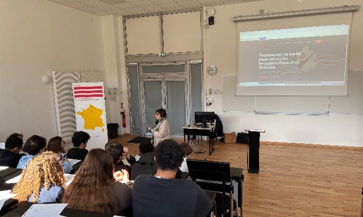 Le 17 mars 2026, au lycée Jean Zay d’Orléans, les deux professeures co-référentes égalité Mmes Legendre et Rebeuf, ont organisé une rencontre entre Elles aussi CVL et des élèves de classes de terminales et BTS (spécialités droit, économie, enjeux du monde contemporain) autour du thème égalité femmes-hommes dans la sphère politique.